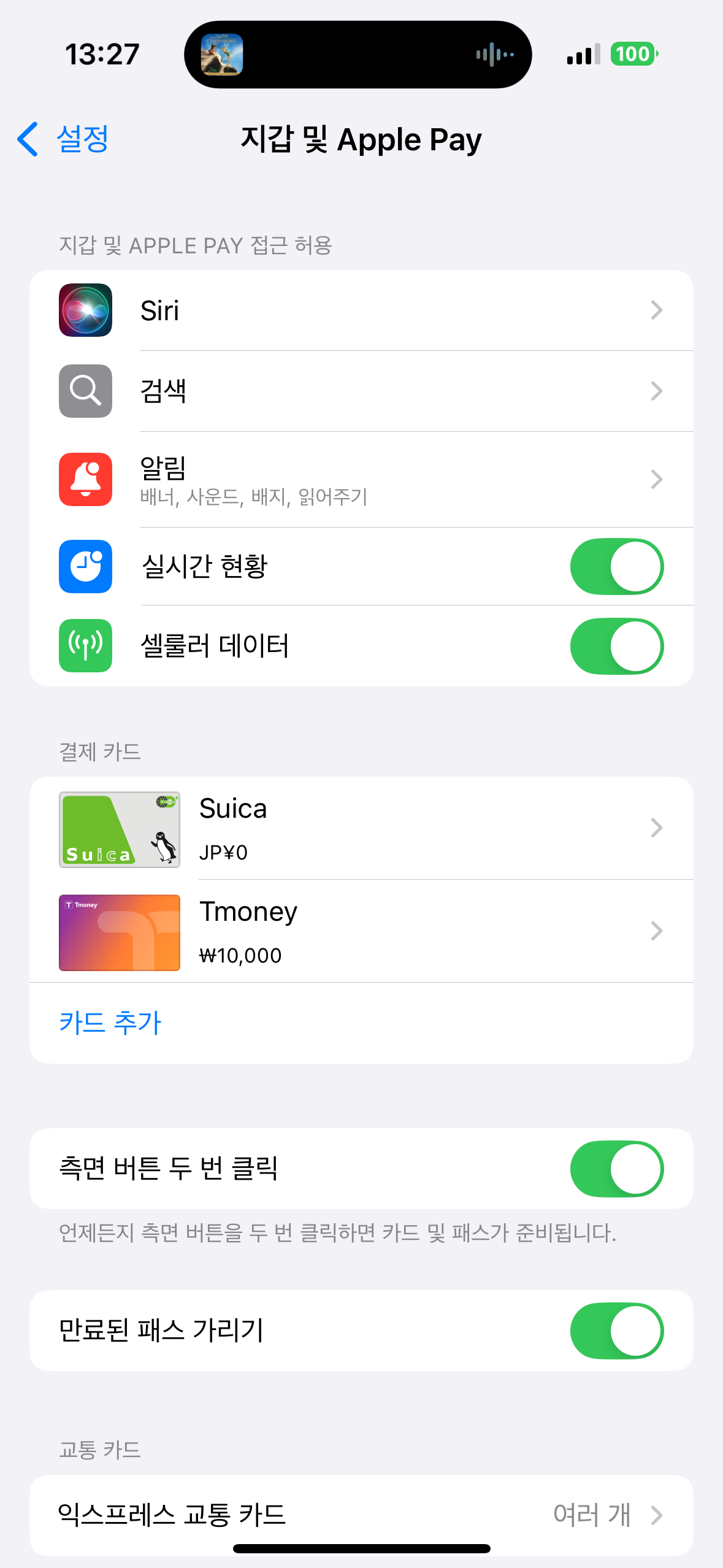 • 기기의 전원이 부족할 때도 잠시 교통카드 기능 유지