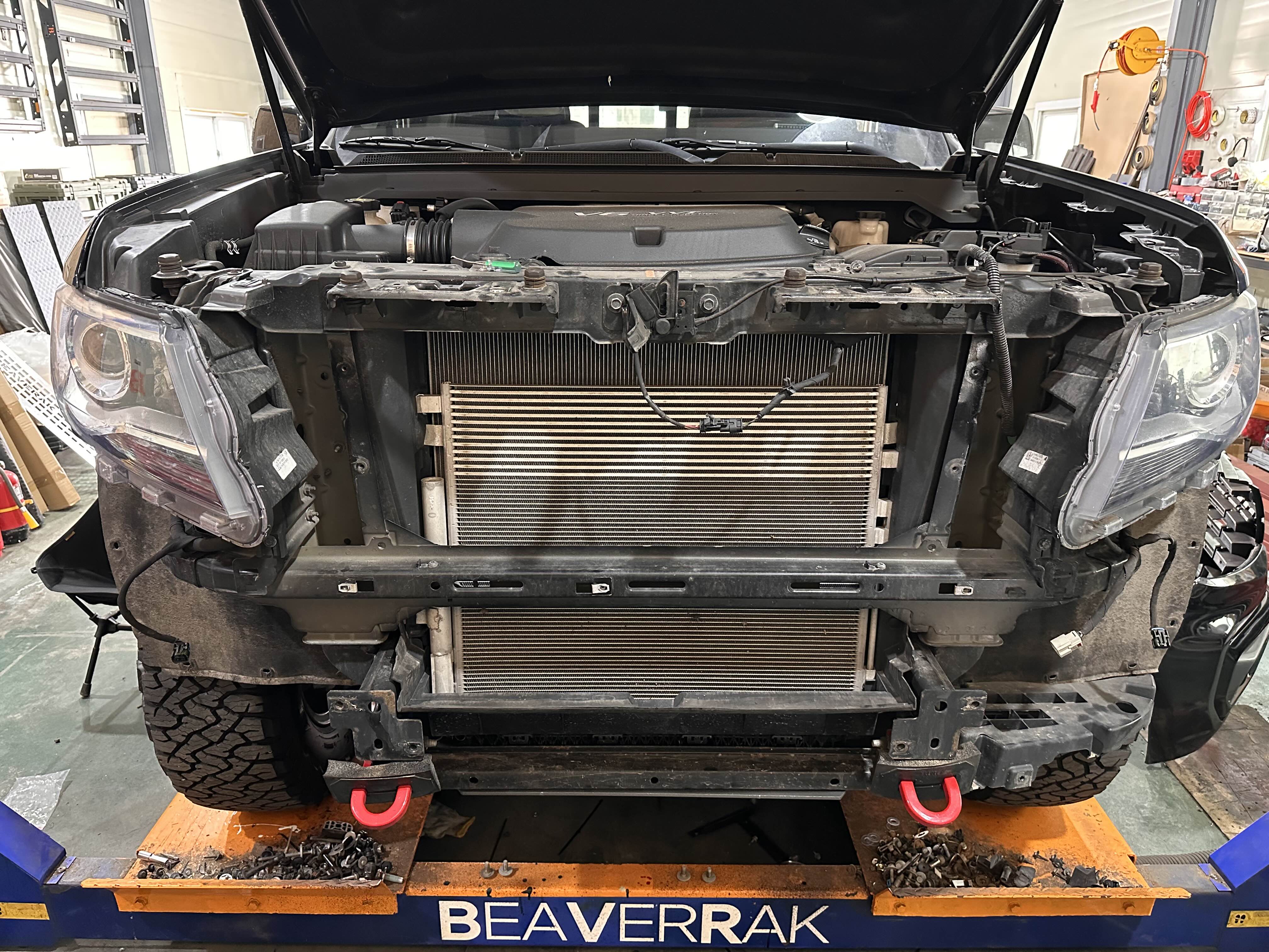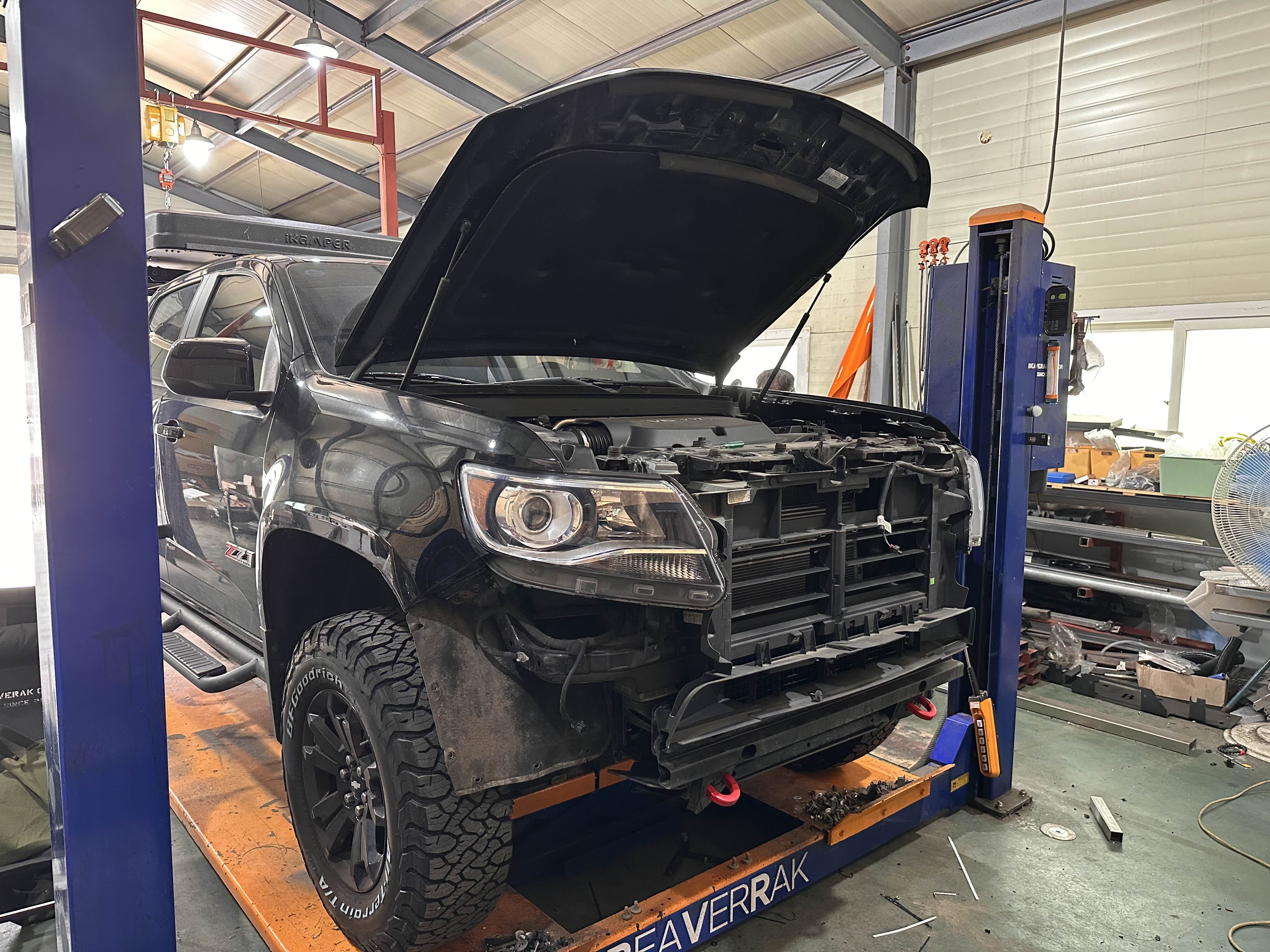 범퍼를 떼고 나니 콜로라도의 튼튼한 프레임이 그대로 드러나더라고요.
