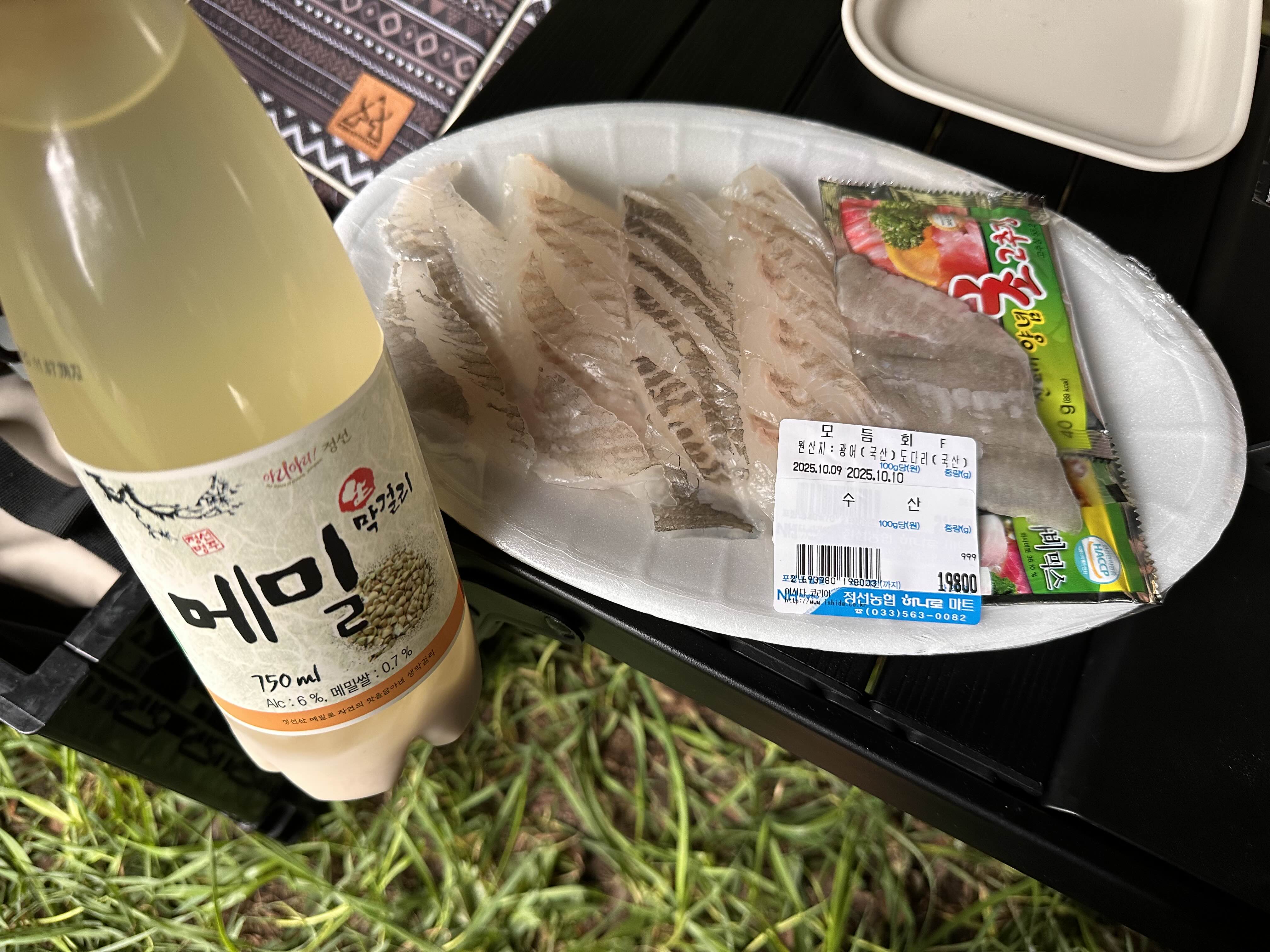 정선 하나로마트에서 사 온 광어회를 정선 메밀막걸리와 함께 곁들여 한잔했습니다.