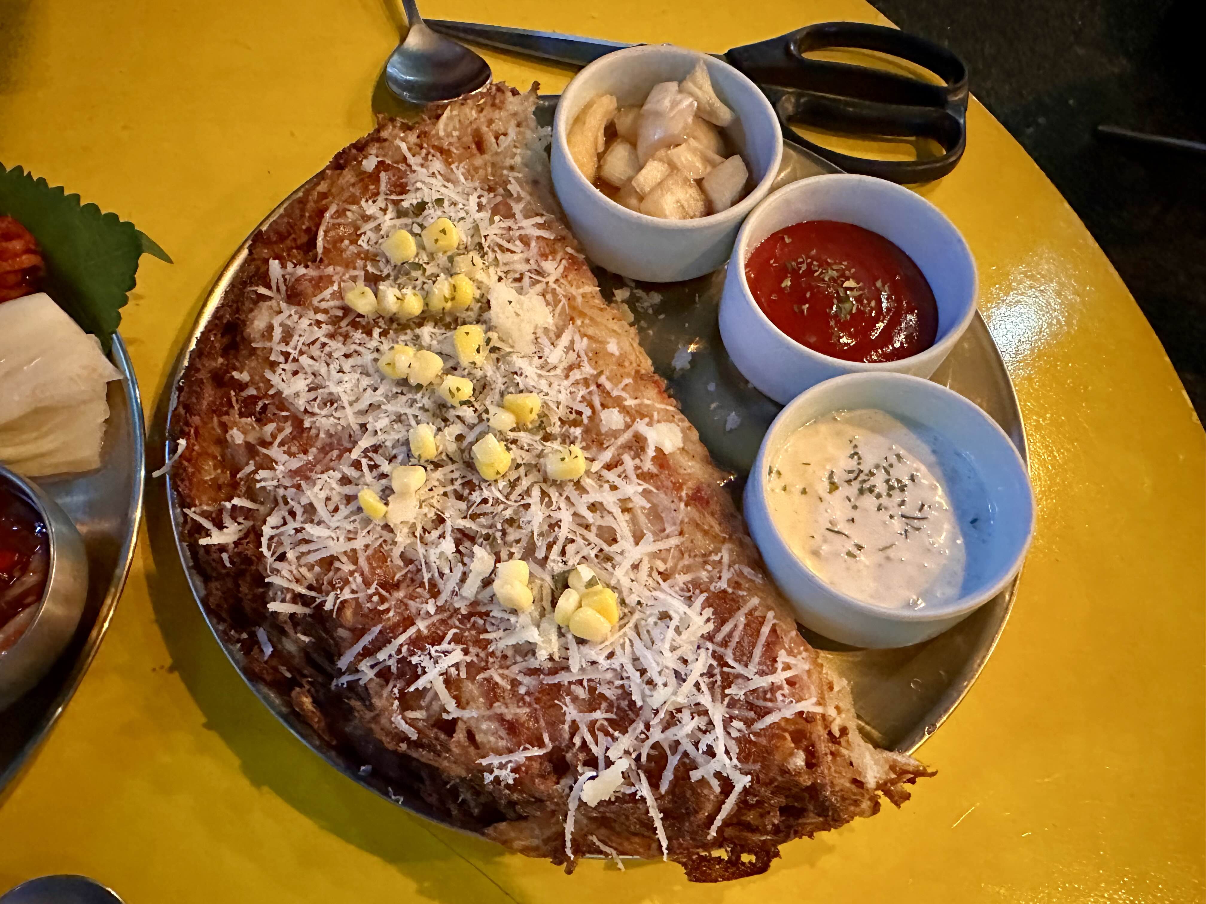 감자전은 흔하지만, 여기에 치즈가 올라간 버전은 처음이라 호기심에 주문했어요. 첫입을 먹는 순간, 같이 마시던 지인과 동시에 박수를 쳤습니다.