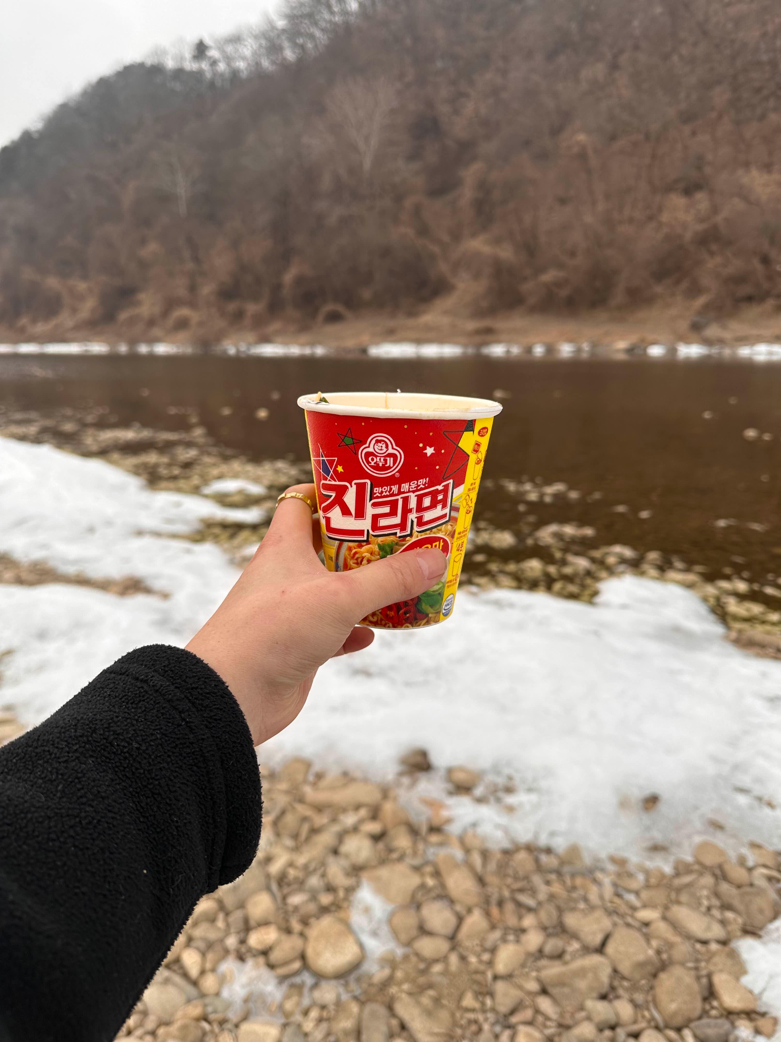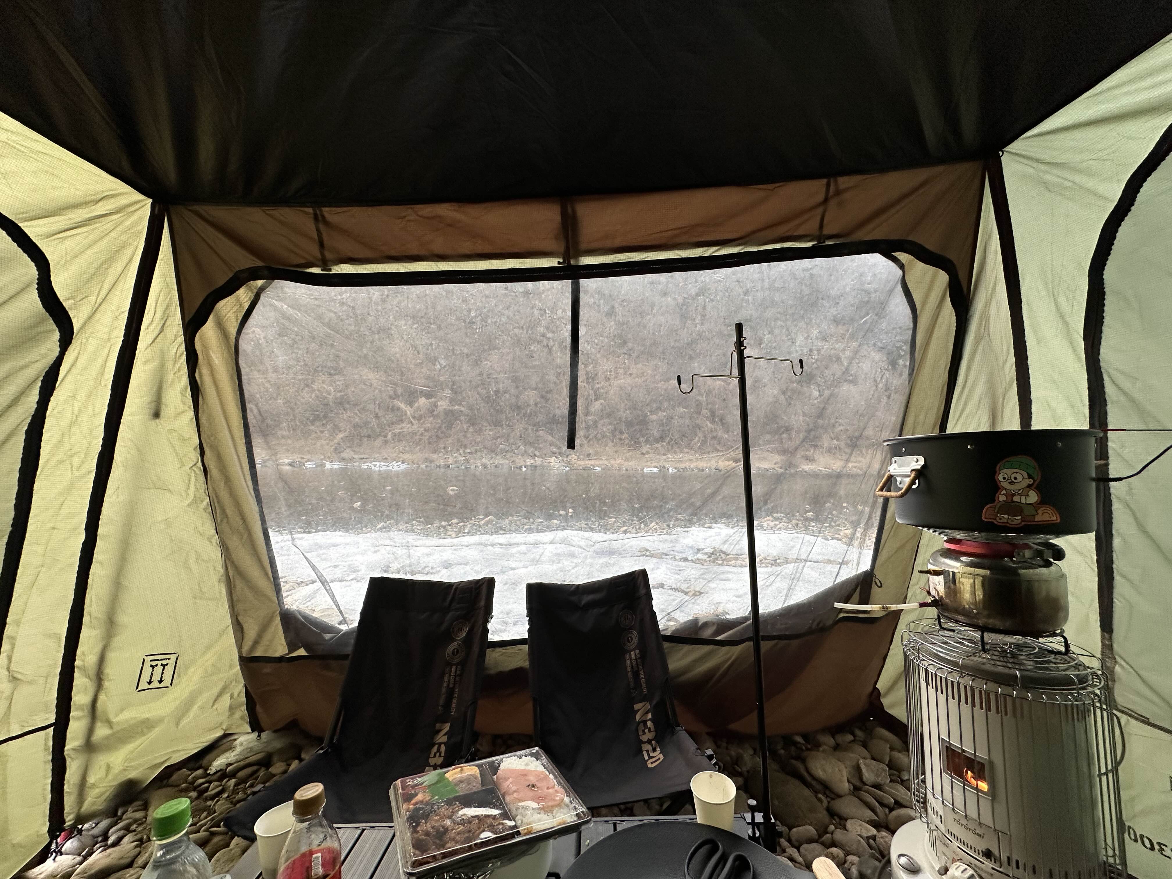 난로 켜진 텐트 안이 너무 더워 밖으로 가지고 나와 먹었는데, 입김 나는 추위 속에서 먹는 매콤한 라면 국물... 이 맛은 정말 말로 표현하기 힘들 정도입니다.