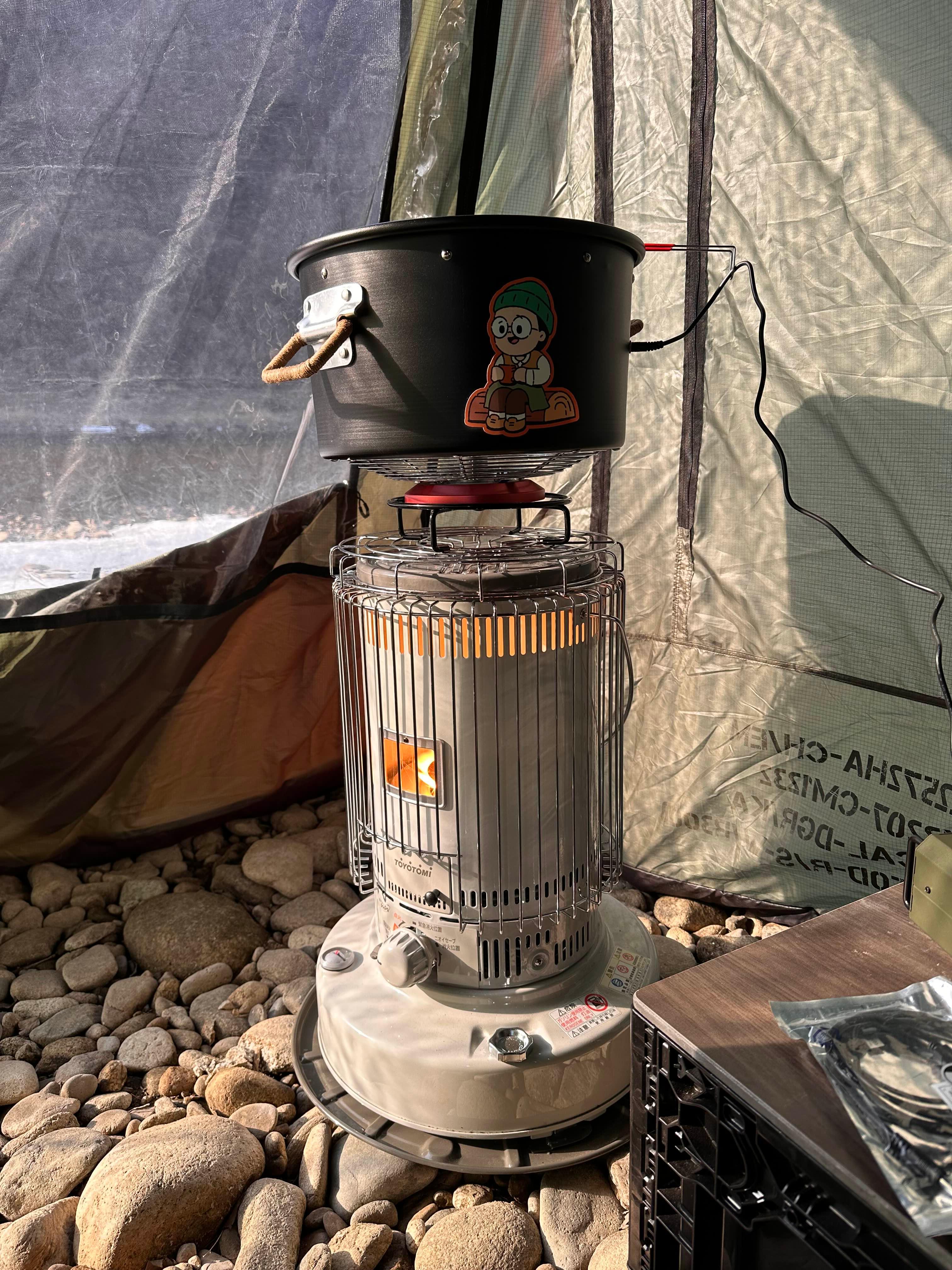 동계 캠핑은 무엇보다 난방이 제일 중요합니다. "더우면 벗으면 되지만, 추우면 답이 없다"는 게 제 지론인데요. 저만의 필살 조합은 **[난로 + 무동력 팬]**입니다.