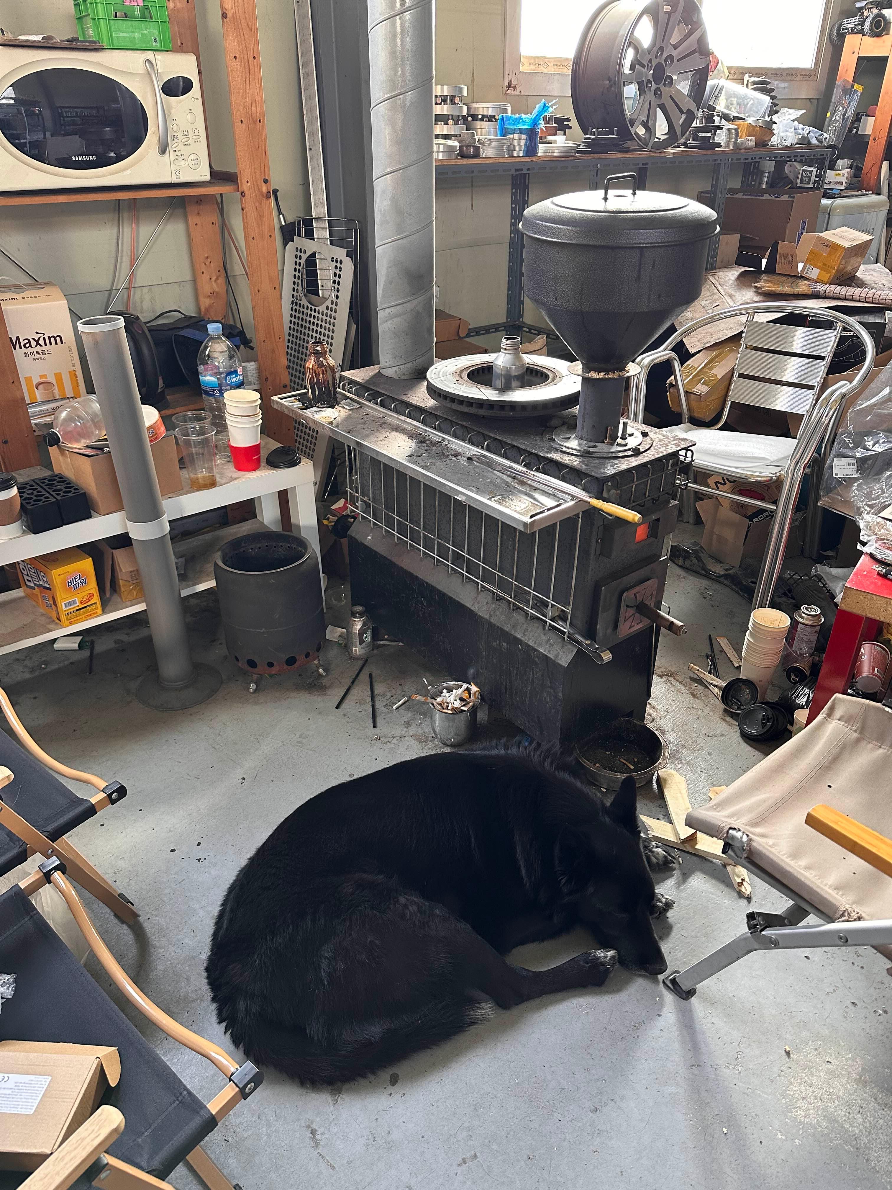 처음엔 살짝 긴장했는데, 따뜻한 펠릿 난로 옆에 얌전히 누워있는 모습이 어찌나 귀엽던지 작업 기다리는 시간이 지루하지 않았습니다.