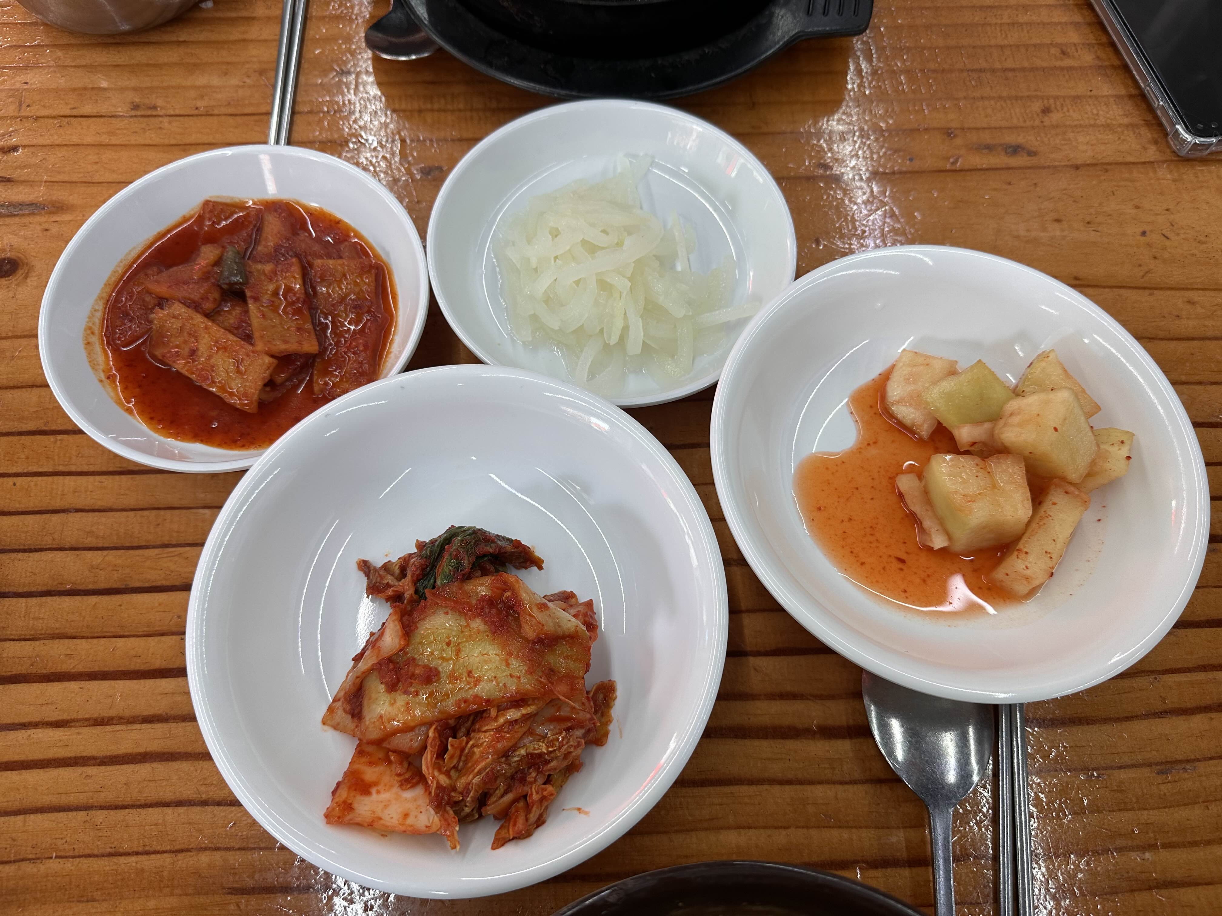 반찬은 소박해 보이지만, 특히 겉절이 스타일의 배추김치가 정말 일품입니다. 해장국과 찰떡궁합이에요!