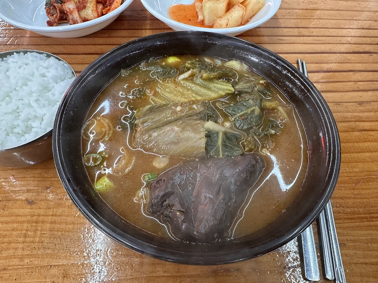 기본으로 선지 한 덩이가 나오는데, 추가 요청을 드리니 보시는 것처럼 뚝배기가 넘칠 듯 푸짐해졌습니다. 선지에서 잡내도 전혀 안 나고 식감이 퍽퍽하지 않아 좋았어요. 부드러운 시래기까지 곁들이니 마치 시장에서 먹던 정겨운 장터국밥 느낌 그대로입니다.