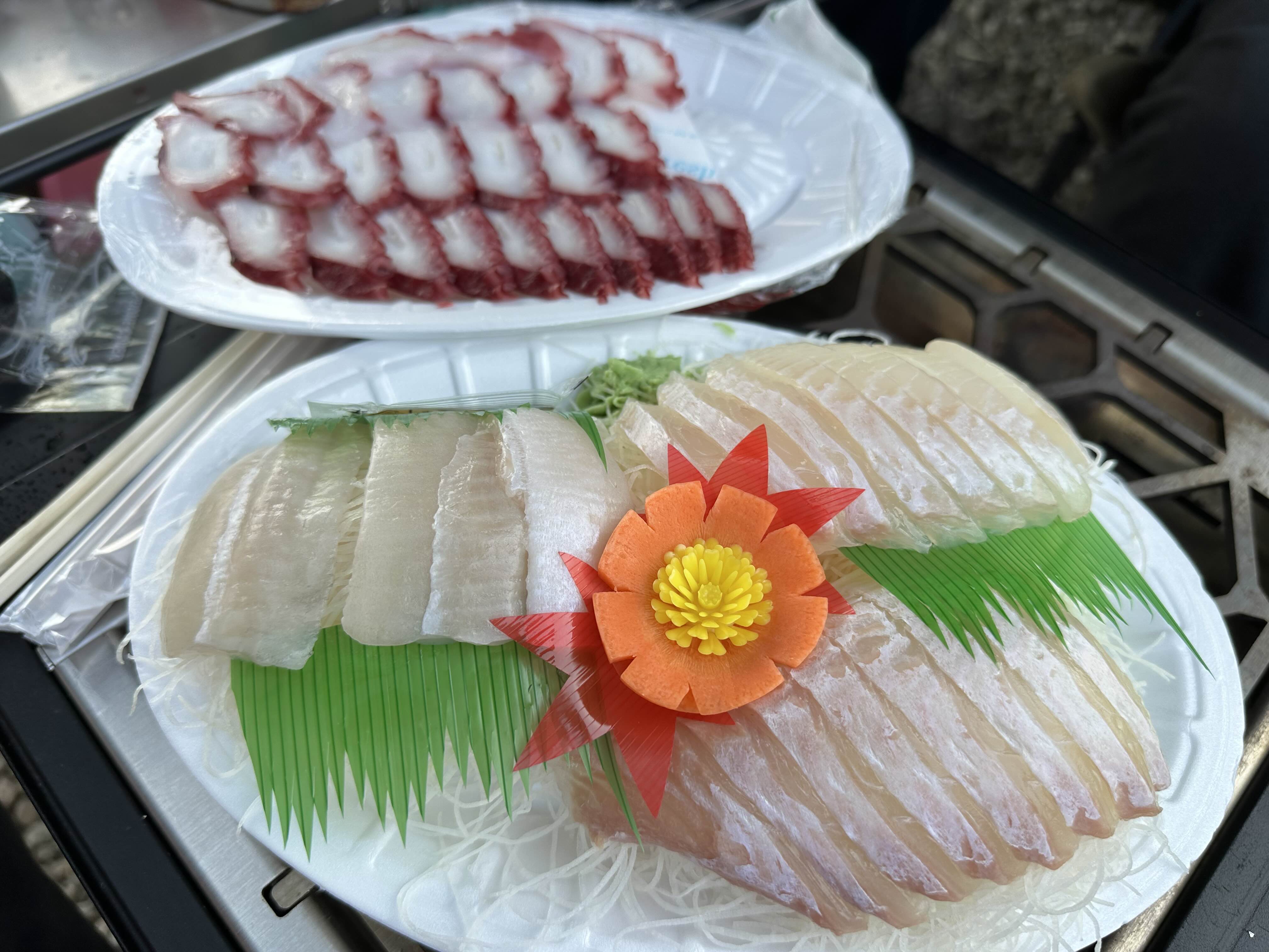 두툼하게 썰린 회 한 점에 한 잔 곁들이니 캠핑장 분위기가 순식간에 완성됩니다.