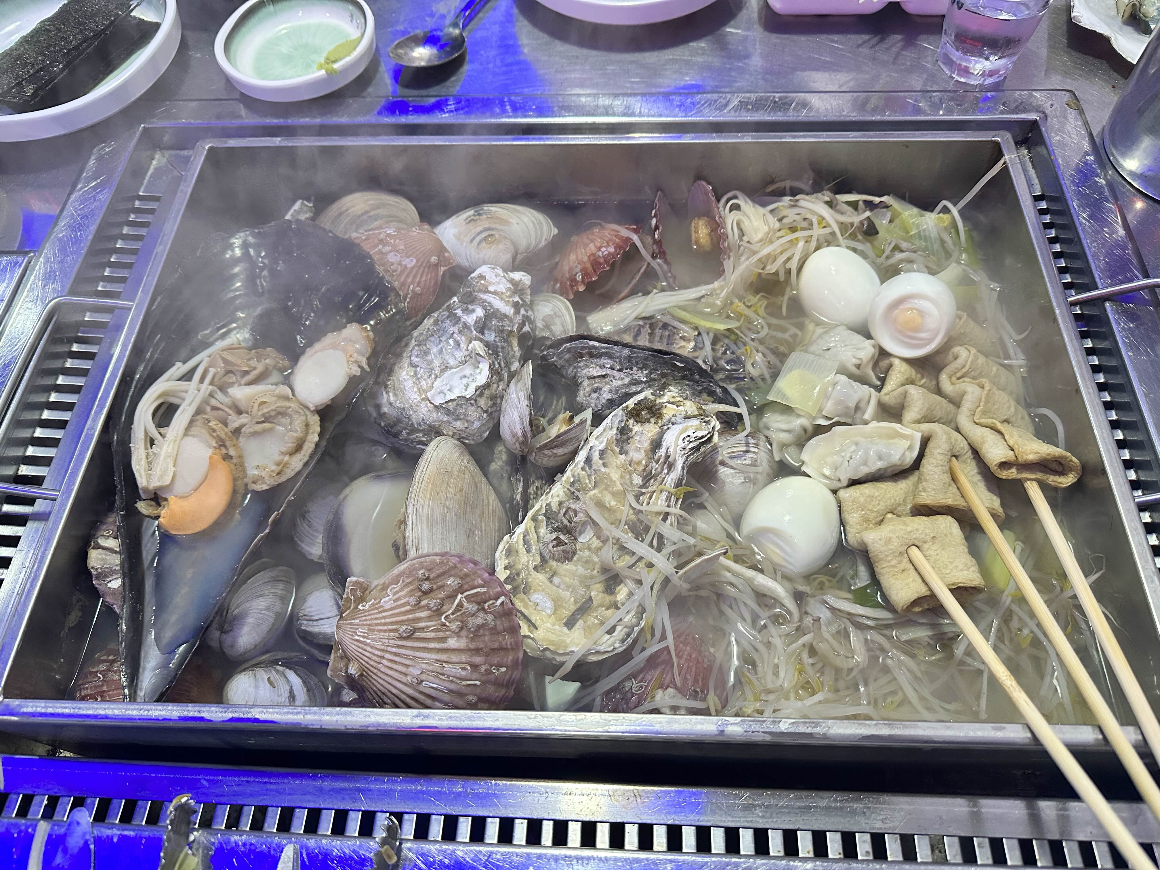 타이머가 울린 뒤 뚜껑을 열어보니 다양한 해산물이 가득 들어 있었습니다.