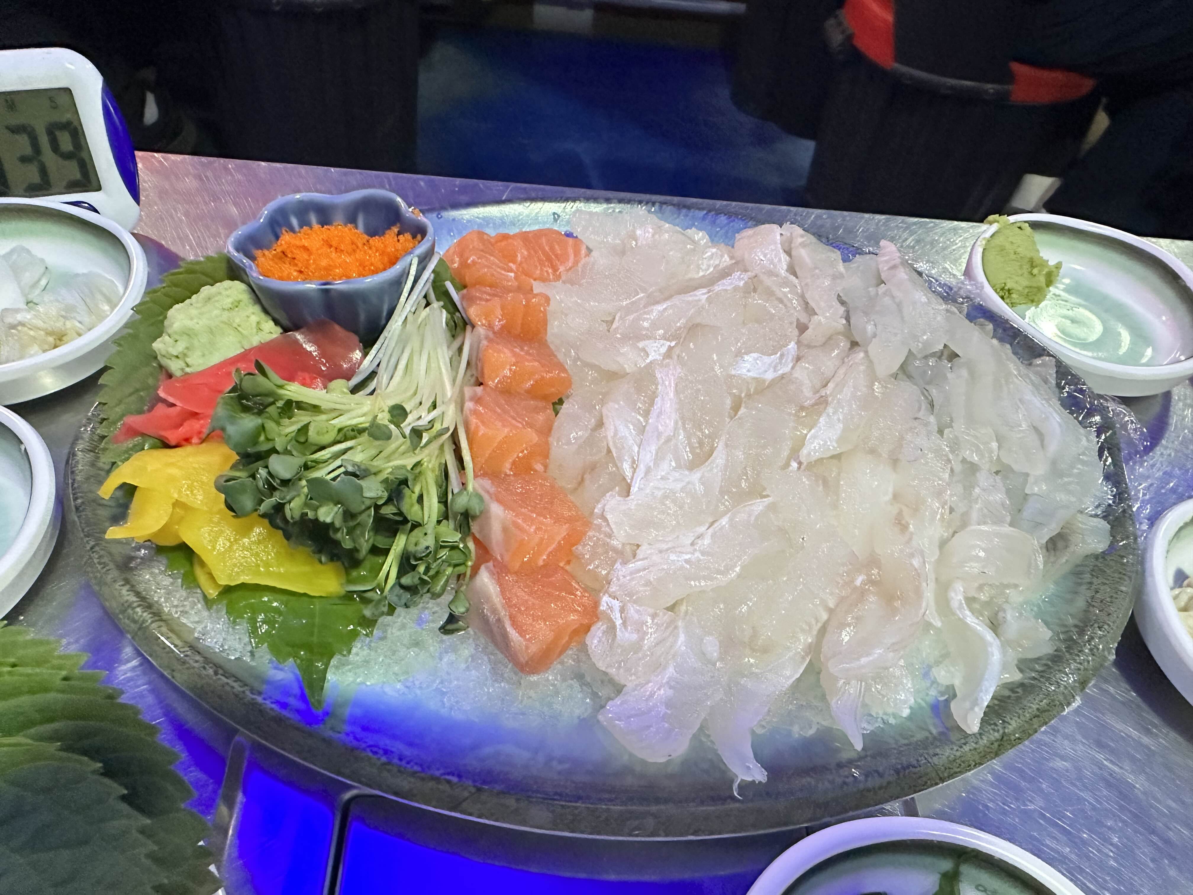 접시에는 광어와 연어가 함께 담겨 있었는데, 막회답게 두툼하게 썰려 있어 식감이 매우 쫄깃한 편이었습니다. 신선도 역시 좋아서 별다른 설명 없이도 맛있게 즐길 수 있는 회였습니다. 😋