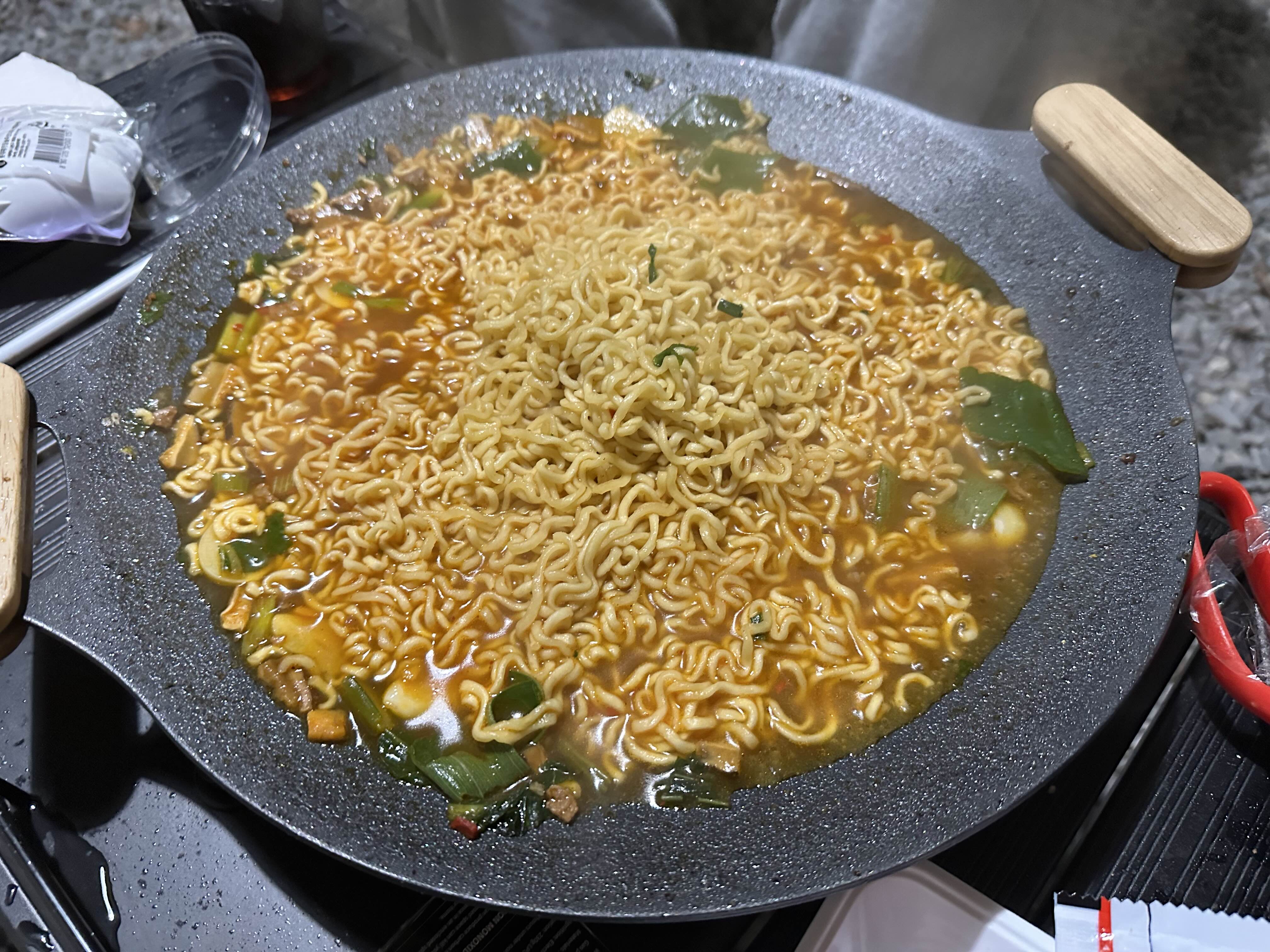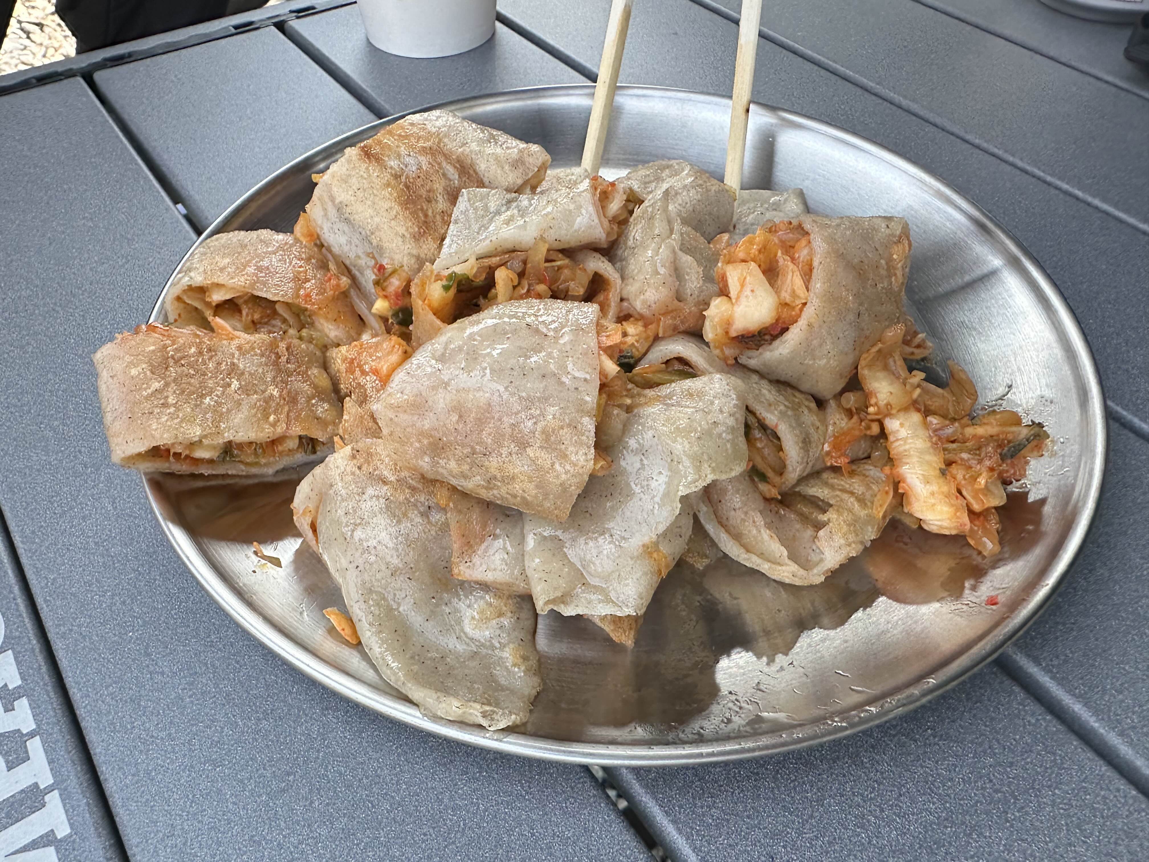 캠핑의 꽃은 역시 음식이죠! 도착하자마자 영월의 명물인 메밀전병과 바삭한 닭강정으로 입가심을 시작했습니다.
