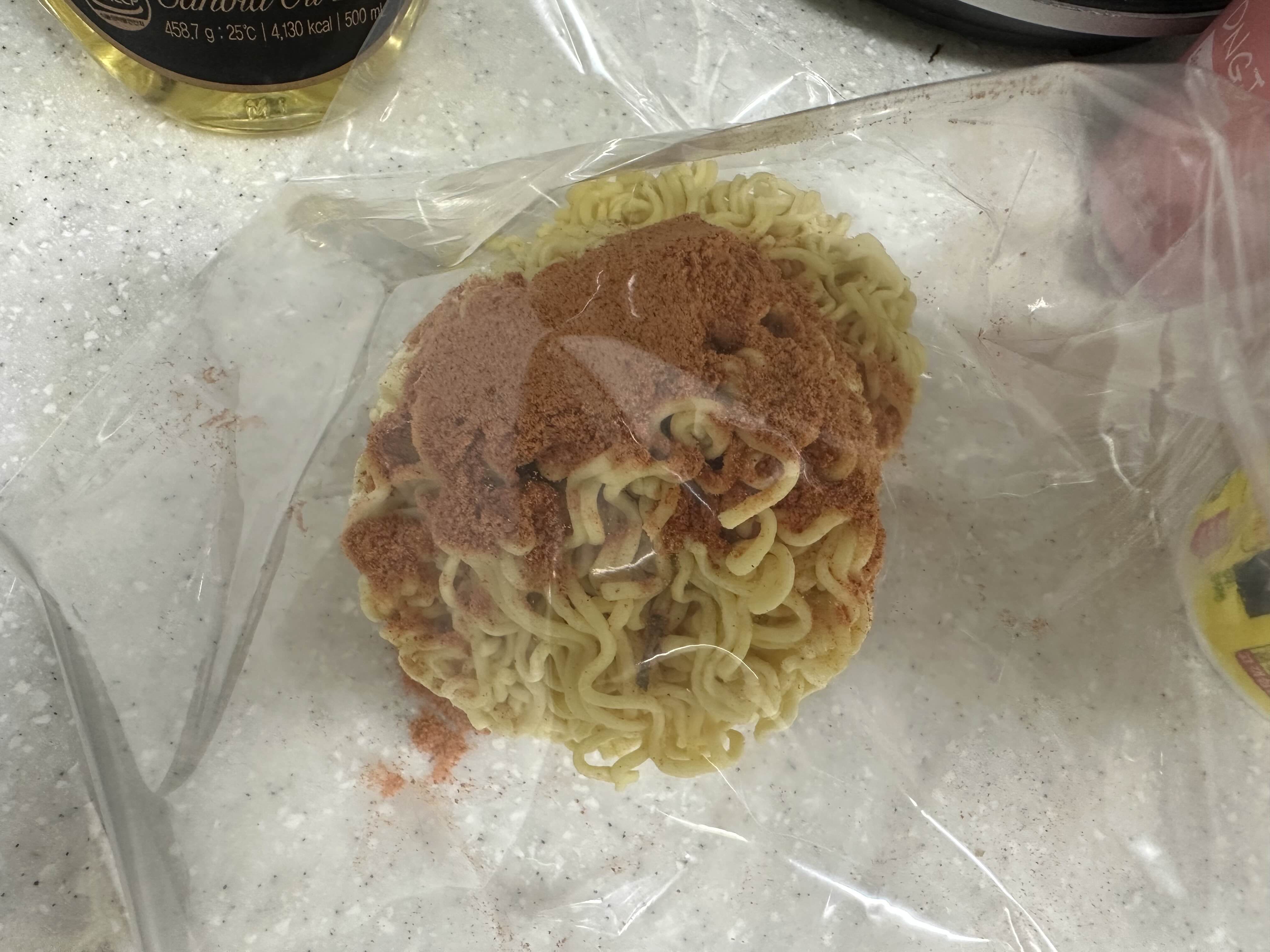 위생팩에 라면과 수프를 넣고 부셔서 깨 봅니다. 일반 비닐봉지는 찢어진다고 해서 위생팩에 넣었는데 이것도 튼튼하지는 않더라고요. 힘껏 깨부스고 나니 그 자리에 소스가루가 남아있는 사태가 발생했습니다. 개미군단이 오기 전에 재빠르게 처리를 해줘야겠네요. 라면은 적절하게 가루까지는 아니더라도 꾹꾹 눌러서 재료를 만들어 주세요. 뿌셔뿌셔처럼 부셔주면 될 거 같아요.
