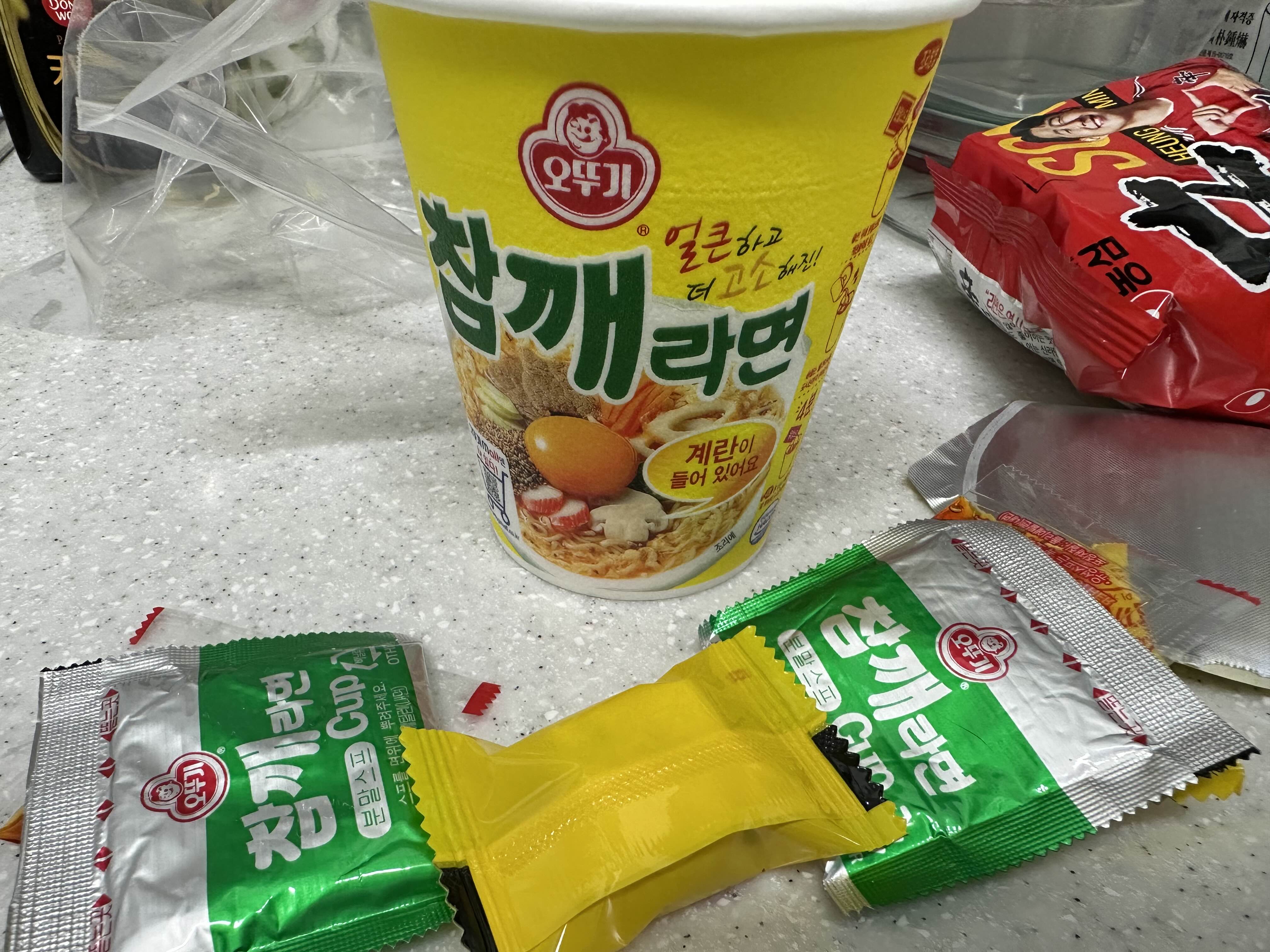 2. 컵라면 기준 절반만 뜨거운 물 붓기 (라면이 잠길 정도만)